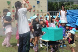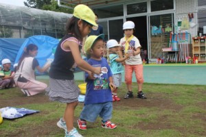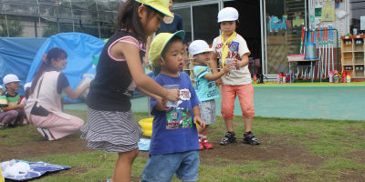 幼稚部さんと保育部さんで手を繋いでコップやビニール袋を使って水を運びました。