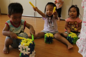 ブロックで太鼓を作り、ライオン組のお友だちの真似をして「ドン、ドン、ドン!」