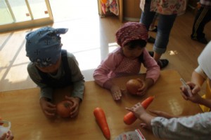 収穫祭が終わった後は、エプロンと三角巾を着てカレーを作りました(*^^)v