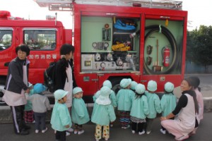 消防車も見せてもらい、子どもたちは「消防車だー!」「かっこいい」
