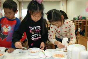 午後のおやつはみんなでビスケットにクリームやチョコでデコレーション