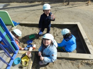 砂場でお店屋さんごっこをし「ジュースですよ♪」みんなにジュースを配っていました(*^_^*)