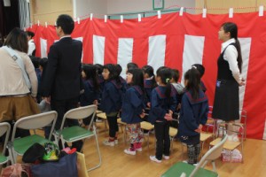 キリン、ライオン組の子ども達は姿勢を正し、先生の話を聞いています。