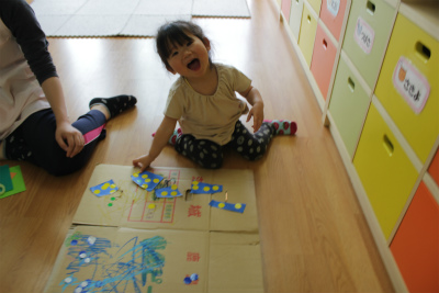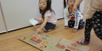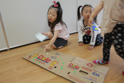 まず、イルカ組は段ボールを使って電車を作っていました。