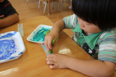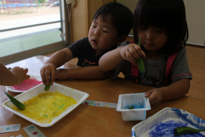 幼稚部では、なんとオクラを作ったお絵かきに挑戦しています。