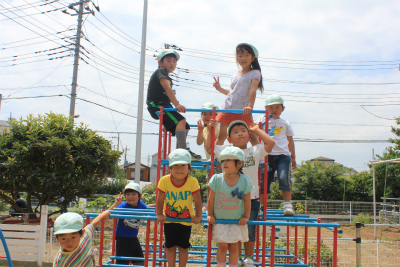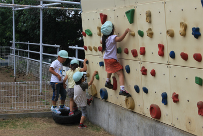 園庭に出てさっそくライオン組は得意のロッククライミングへ
