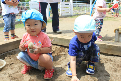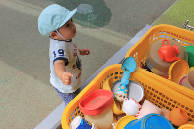 どれ使ってあそぼうかなー?と砂場で遊ぶおもちゃを選んでいます(*^_^*)