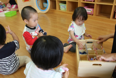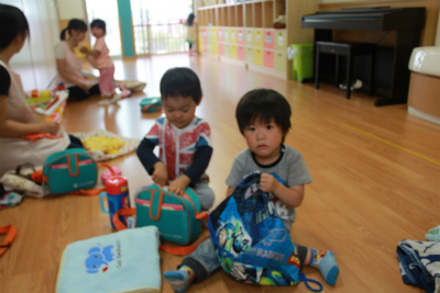 「おはよう」と元気よく登園してから子どもたちはそれぞれ自分たちのお部屋へ・・・