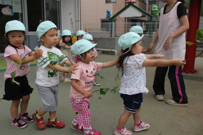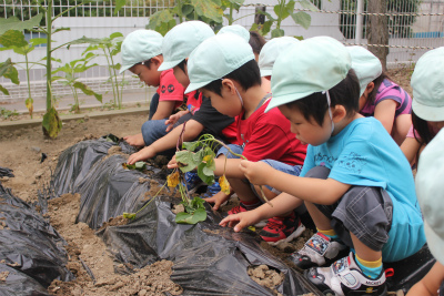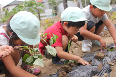 幼稚部のお友達は今日サツマイモの苗を植えました。