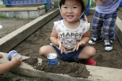 ニコニコ笑いながら子どもたちと一緒にいろんなご飯を作って遊んでいます。