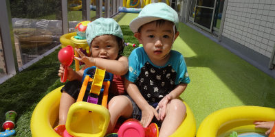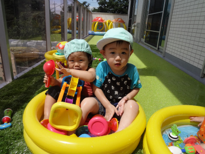ペンギン組のお友達は、水遊びをしました(*^_^*)いろんな玩具を持ってバシャバシャと楽しんでいますよ(^^♪