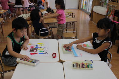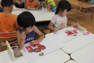 午後は、夏祭りの印象画をみんなで描きました(*^^)v「太鼓をやっている絵だよ」や「「踊りの絵だよ」と先生に教えてくれました(*^^)v