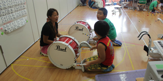 先生と一緒に歌いながら叩き、リズムを覚えます!!