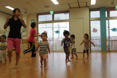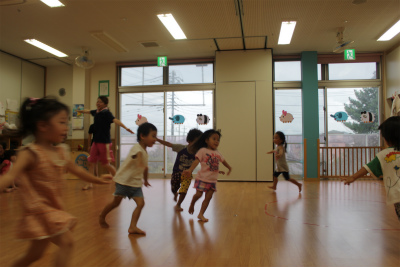 まずは‘とんぼのめがね’です!両方の手を左右に伸ばして爽快に走ります♪