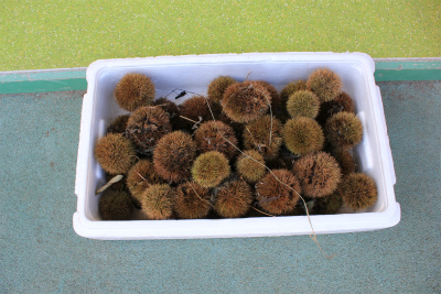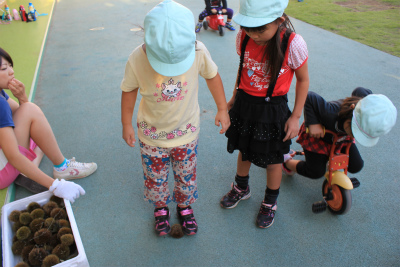 キリン・ライオン組のみんなで栗を割って出しました。足を使って中身を出すのになかなか苦労しました(*_*)