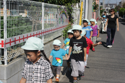 幼稚部の子は一生懸命に手をつないで保育部の子のペースに合わせながら