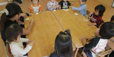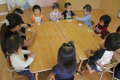 ペンギンさんはお部屋で小麦粉粘土をして遊びました。粘土の感触を楽しみながら摘まんだり、伸ばしたり、ちぎったりして指先を十分に使いながら夢中になって遊んでいました(*^_^*)