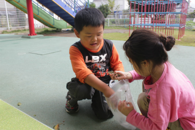 台風も午前中にはすっかり通り過ぎていいお天気になりました☀幼稚部のお友達は園庭に出て何かを拾っています。