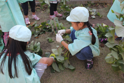 「サツマイモのつるを切ってるんだよ!!」と元気な声が返ってきました。