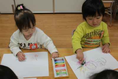 好きな色を選んで「描き描きー」と言いながら自由に描き楽しんでいました。