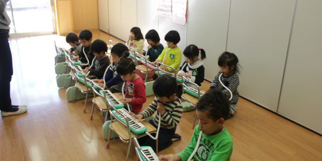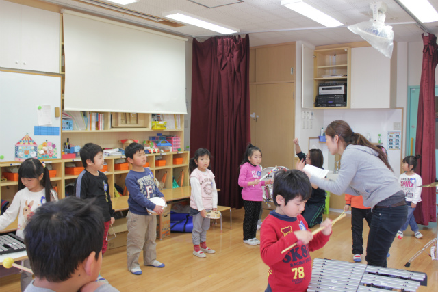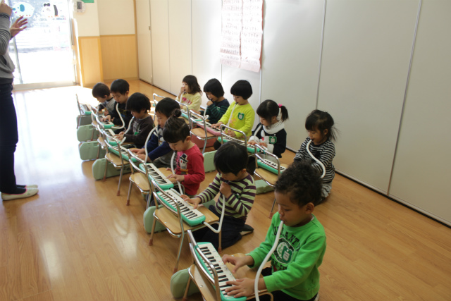 外部から先生が来て下さり、幼稚部の子どもたちにピアニカや太鼓など楽器の指導をしてくれました。