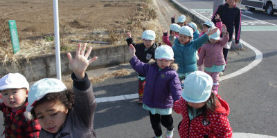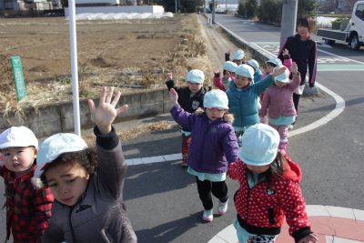 道路を渡るときはしっかり手を挙げて渡ります!きちんと右左右も確認しますよ(^^)