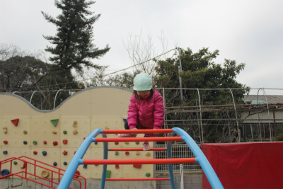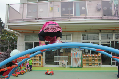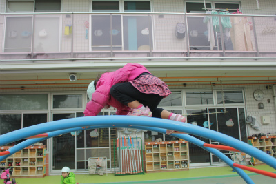 そんな中、太鼓橋に挑戦中のイルカ組(2歳クラス)の子がいました。