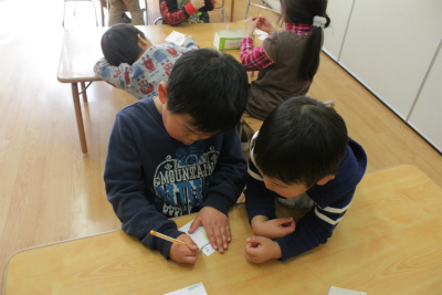 パンダ組のお友達には少し難しかったようで、ライオン組やキリン組のお友達に手伝ってもらいながら取り組んでいました(*^_^*)