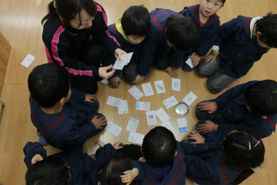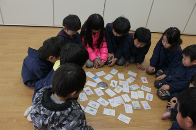かるたを作っているときに「〇〇から始まる言葉って何かあるかな~」とある子が言うと、周りにいるお友達が一斉に「〇〇!」と色々な候補を教えてあげていました♪
