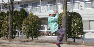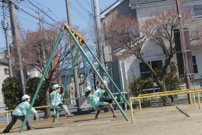 土山公園に着いたみんなは大はしゃぎで、それぞれの遊具に乗って遊んでいます。