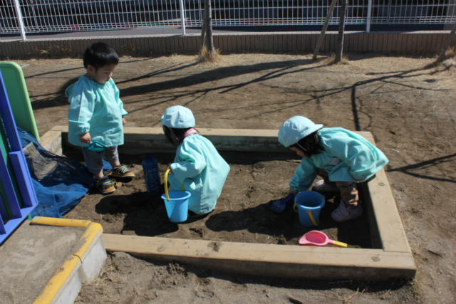 砂場の道具をたくさん持ってきて、みんなでレストランごっこをしました(^_^)v