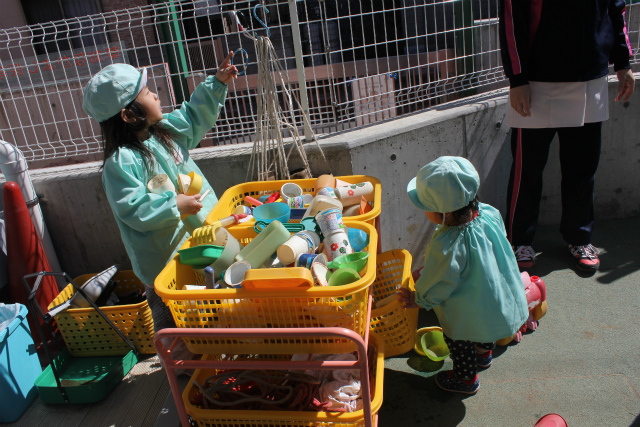 これは砂場で遊ぶ用のカップやシャベルなどがたくさん入っている箱です☆