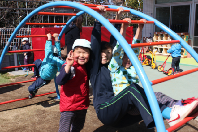 ライオン組の子は、先生と太鼓橋にぶらさがってはいチーズ★