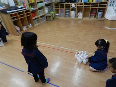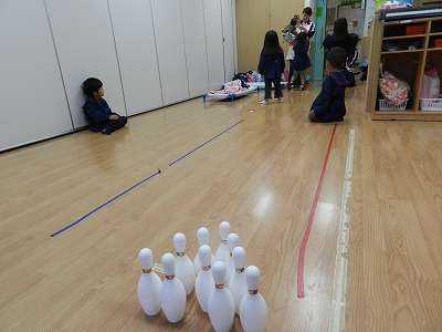 順番に並んでボールを投げて、待っている子や投げた子がピンを立てます。