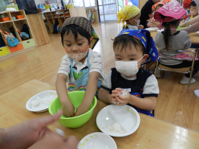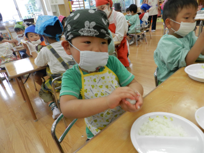 午後はおやつの前に食育活動でおにぎり作りがありました。