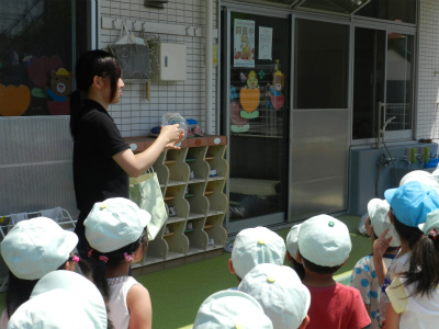 本日配布のお便りにも記載がありますが、イルカ組、パンダ組、キリン組、ライオン組さんは、水筒の持参をお願いいたします。水筒の中にはお茶もしくはお水を入れて持ってきてください。今年も暑い日が続きそうですので、細目に水分補給をしながら元気に楽しく過ごしたいと思います。