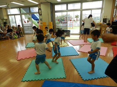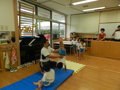 てっちゃん先生とのいつもの体操教室をお父さんお母さんに披露しました* ̄- ̄)