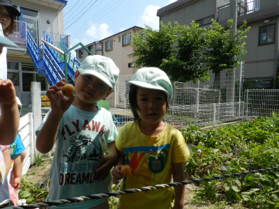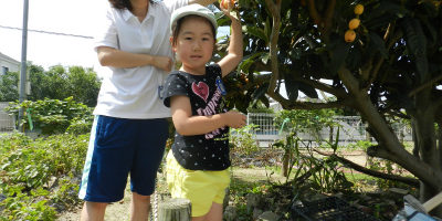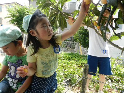 朝は幼稚部のお友達が農園にたくさん実をつけたビワの収穫を行いました。