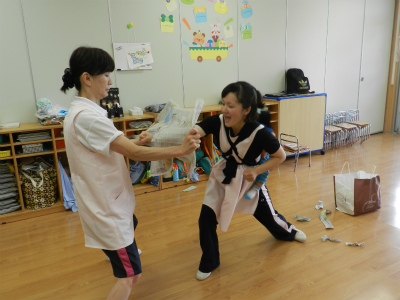 今日は新聞紙遊びをして楽しんでいたようです。