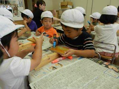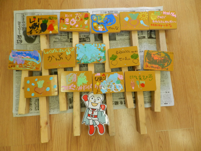 畑にカブの種をまいてみんなで育てるようで、自分の看板をペアのお友達と作りました。