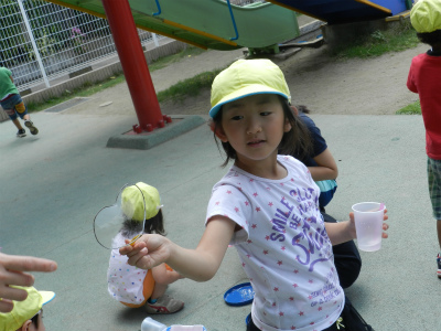 自分たちで針金をいろいろな形にまげてシャボン玉をして遊びました。