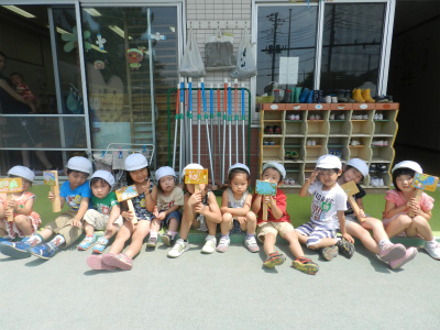 みんなが手に持つのは、先月の縦割り保育で作った看板です!