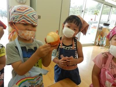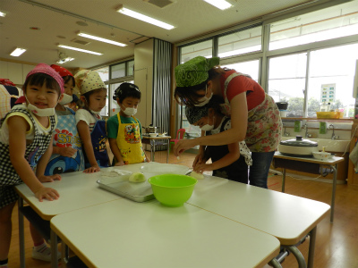 保育部のお友達も、幼稚部のお友達もお母さんが用意してくれたエプロンや三角巾を得意気に見せてくれました。