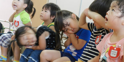 音楽が流れるとみんなで一斉に目を覚まして歌を歌います。