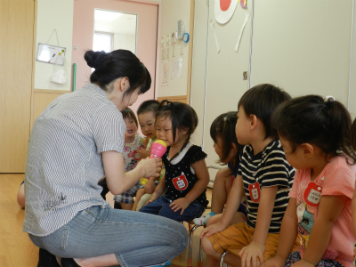 「わあ!!」と驚くお友達や先生の様子を見て大笑い!!いたずらしていた子はもちろんですが、周りで見ていた子もとっても楽しそうです。