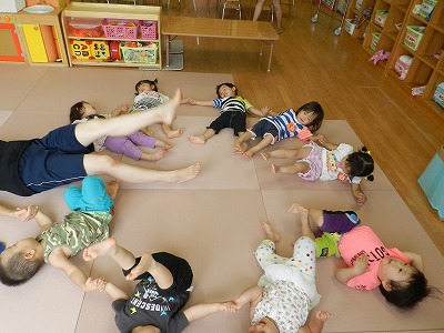 先生が後ろに倒れるとみんなも一斉にごろーんと熱転がります(^o^)