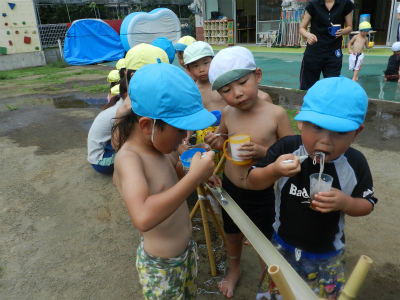 幼稚部は手ぬぐいを目隠しにしてみんなの声を