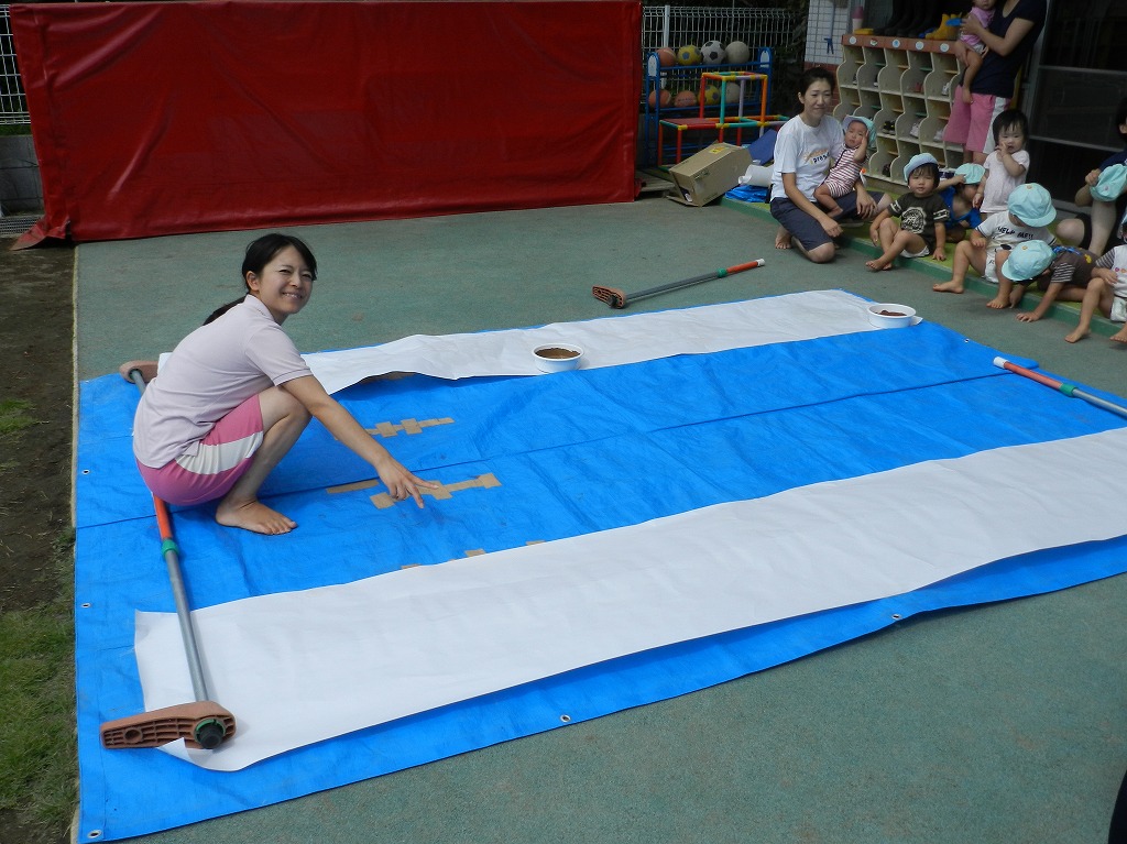 目線のさきには大きなブルーシートの上にひかれた大きな紙!!