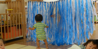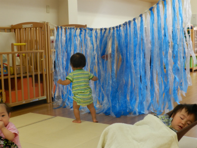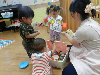 落ちている玩具を先生に渡して、きれいになった玩具をかごにしまってくれるんですよ。