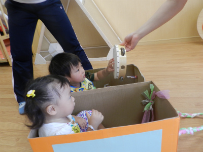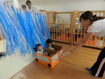 「これなんだろう・・・・?」と興味はあるけれどなかなか反対側へ行けずに立ち止まってしまいましたが、先生が引っ張ってくれる車に乗ると